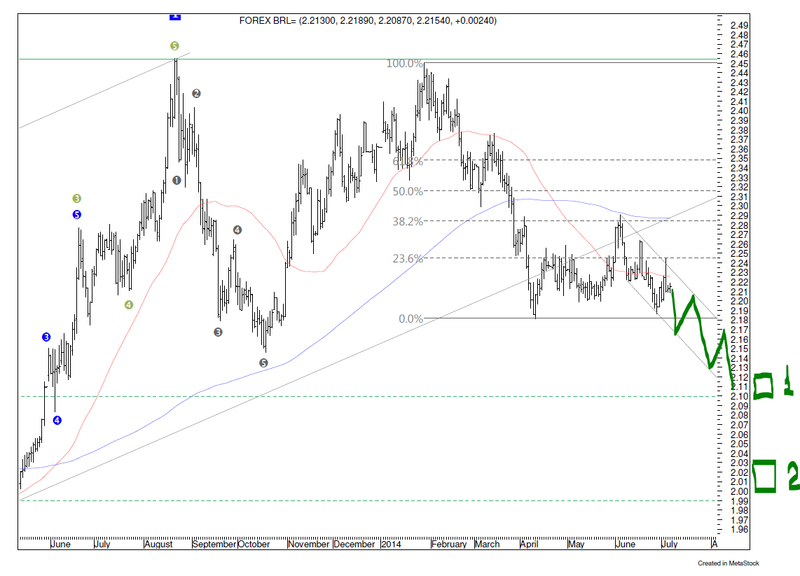 Em relação a nossa moeda o real, o dólar está se segurando bem, no post o-antiPIB-americano fiz os seguintes comentários: ...Enquanto este patamar (R$ 2,18) não for rompido, nosso target terá que esperar. Pode acontecer também que, esta correção se arraste por mais tempo, e aí as observações do post jogo-decisivo-do-fed, ficam valendo ... Vejam o gráfico a seguir.