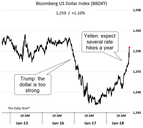 Não deu outra, o gráfico a seguir do índice do dólar publicado pela Bloomberg , mostra que a moeda americana deu meia volta e retornou ao ponto que estava antes da declaração de Trump.