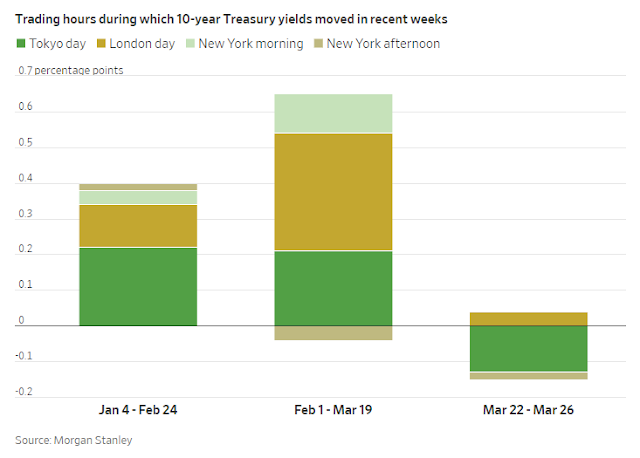 Nos bastidores, de acordo com investidores e analistas, foram outros fatores que impulsionaram a venda de títulos do governo dos EUA, empurrando os preços para baixo e os rendimentos para cima. Um fator foi a venda pesada por investidores no Japão, que estavam apurando o retorno de seus investimentos para o encerramento de seu ano fiscal.