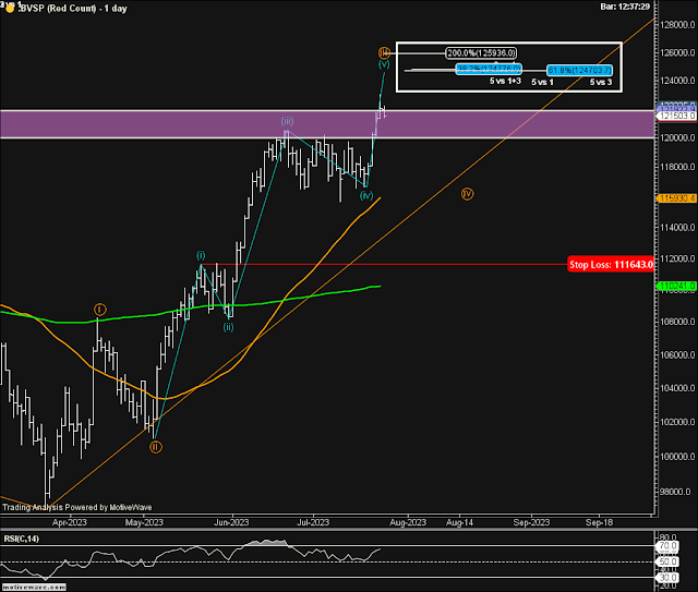 A bolsa acabou atacando a área em roxo como eu havia mencionado acima. Numa análise mais detalhada, eu chego a um objetivo ao redor de 125 mil, como destacado a seguir. Eu pretendo entrar com uma sugestão de compra na retração da onda (iv). É razoável supor que uma área tão congestionada destacada em roxo o mercado deva retestar essa região, onde o nível de 116 mil seria o mais provável.