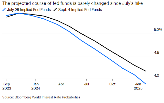 No jargão cada vez mais usado, parece que as estimativas de r* — a chamada taxa neutra na qual a política monetária não é restritiva nem expansiva — estão aumentando. R* é tema de um dos debates mais acalorados da classe econômica. Ou deve conduzir toda a política econômica, ou é um número que só pode ser conhecido em retrospectiva. Mas, em geral, se a economia é relativamente dinâmica, faria sentido que as taxas se fixassem em um nível mais alto, enquanto elas são menores quando estiver lenta. Esse é exatamente o padrão do rendimento de 10 anos no gráfico acima. Então, isso representa um aumento constante na taxa natural à medida que o crescimento permanece resiliente, ou os rendimentos mais altos dos títulos implicam que as taxas (e os rendimentos) estão agora se tornando verdadeiramente restritivos. O chair do Fed, Jerome Powell, abordou o assunto na passagem mais discutida de seu discurso em Jackson Hole, e pareceu estar do lado do último. Mas com algumas ressalvas: