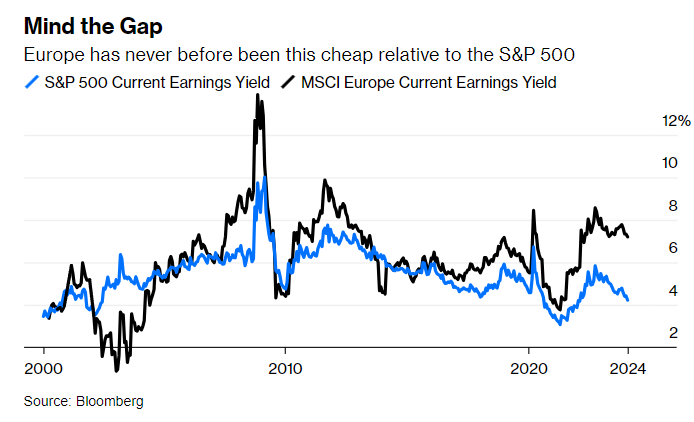 Considere o seguinte: os EUA estão atualmente com a maior diferença entre o rendimento atual de lucros do S&P 500 e o Índice MSCI Europe já registrada. Em termos simples, a Europa nunca esteve tão barata em relação aos EUA. O rendimento de lucros que os investidores obtêm dos ativos europeus parece muito mais atraente do que o benchmark americano.